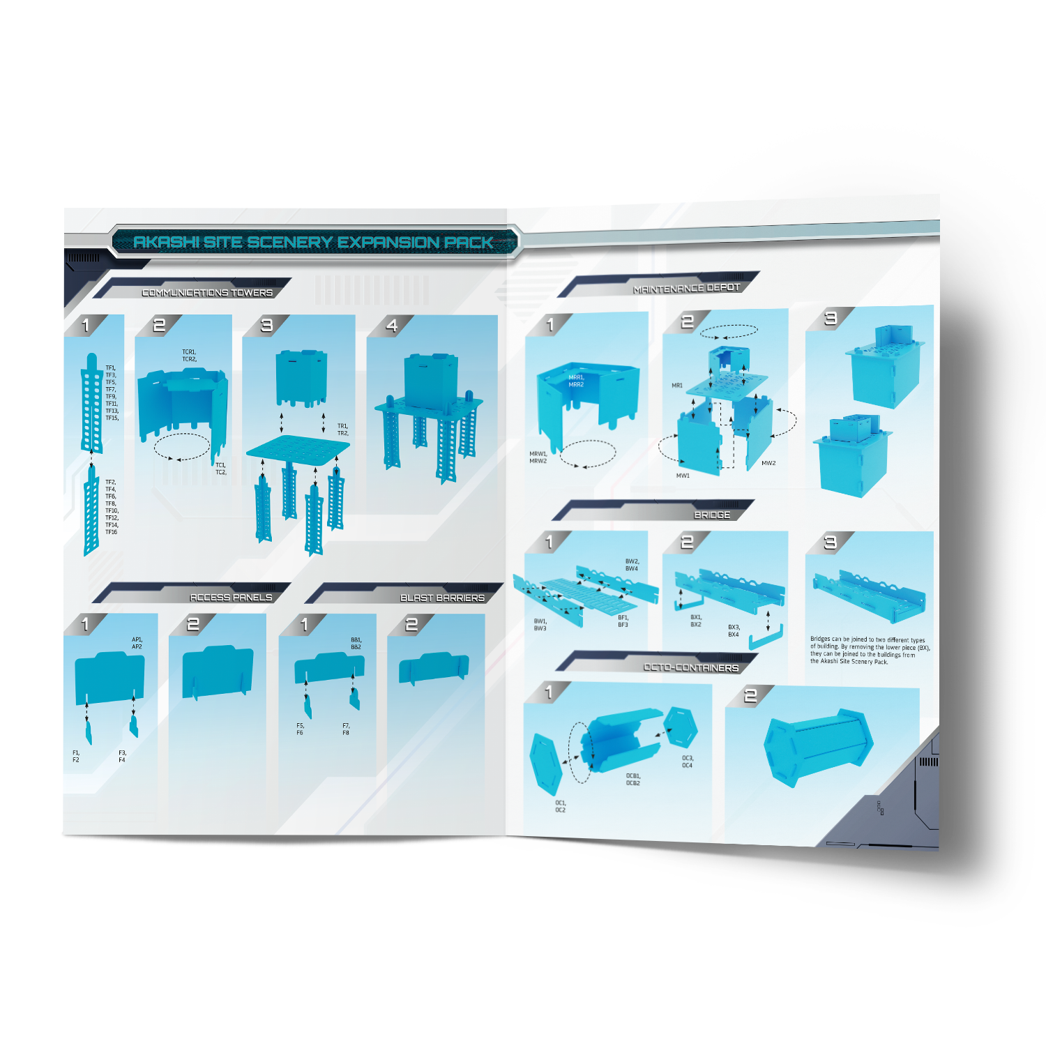 This double sided 2mm printed cardboard Scenery Pack includes two Communication Towers, one Maintenance Depot, 2 Blast Barriers, 2 Access Panels with two different designs, two Octo-Containers, two Bridges, and a 24x32 inch paper gaming mat.