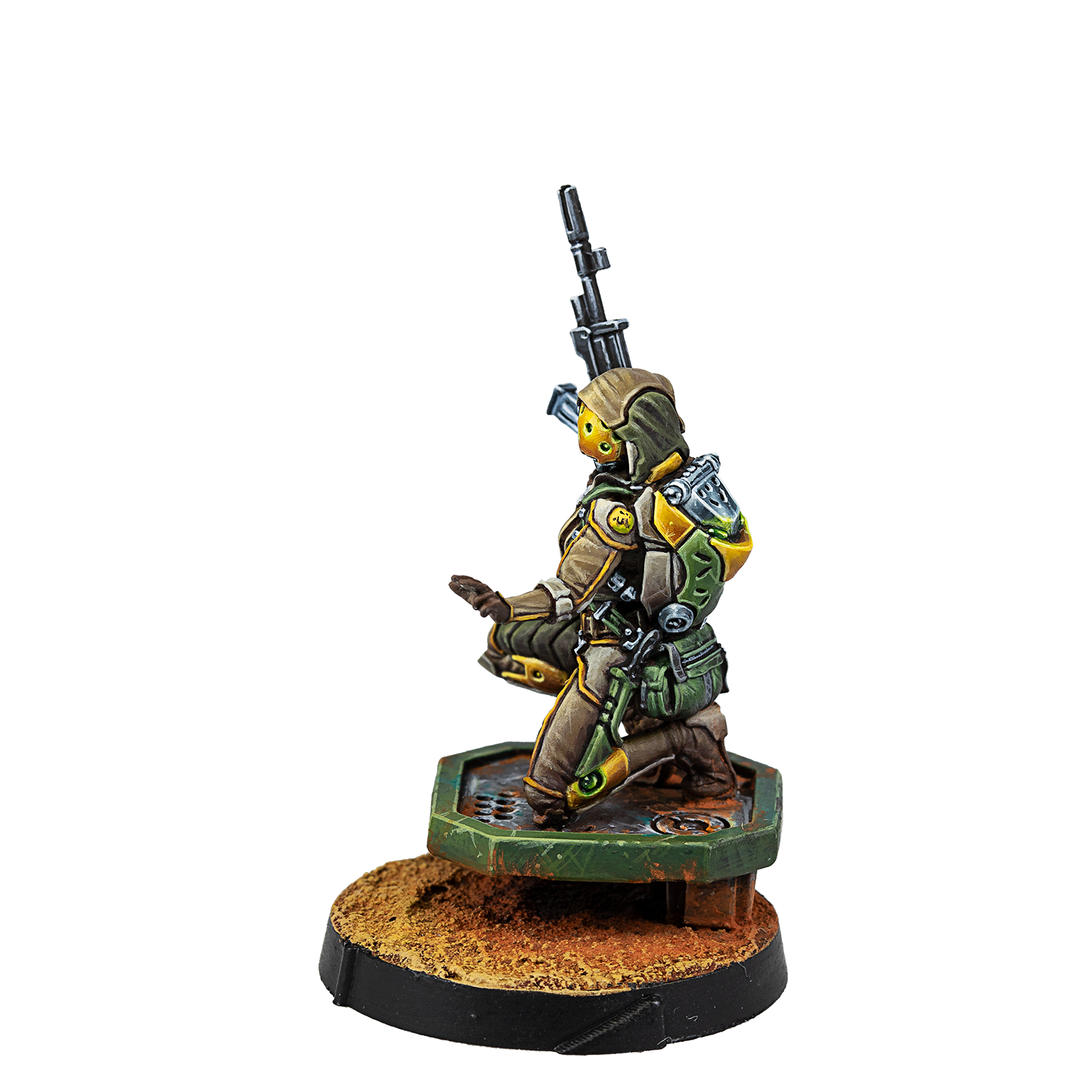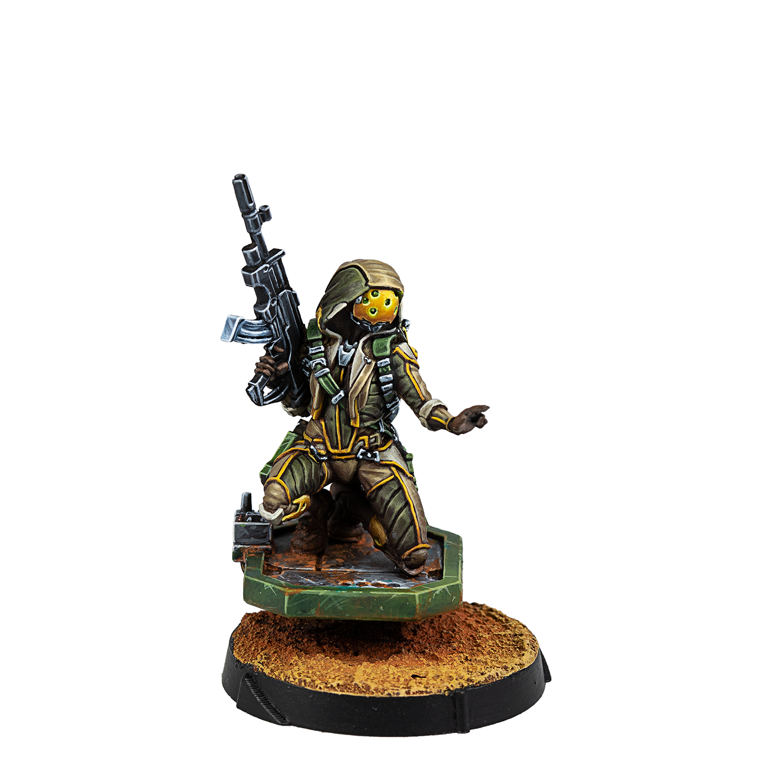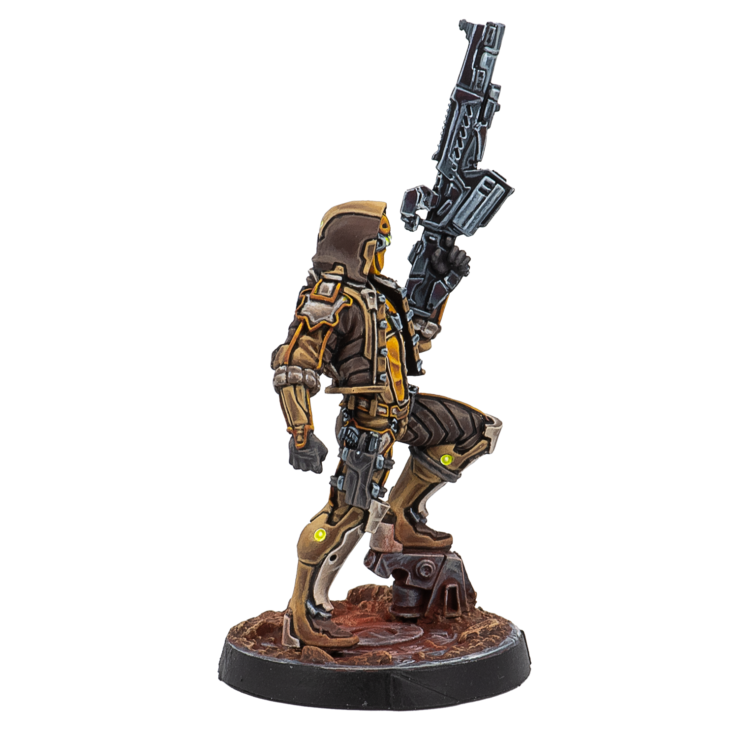This box includes two miniatures: 1 Mukhtar Hacker, and 1 Mukthar with Red Fury. Their high mobility and Forward Deployment Special Skill will provide to your Haqqislam force (REF: 281408-0844) an impressive ability to maneuver around the game table.