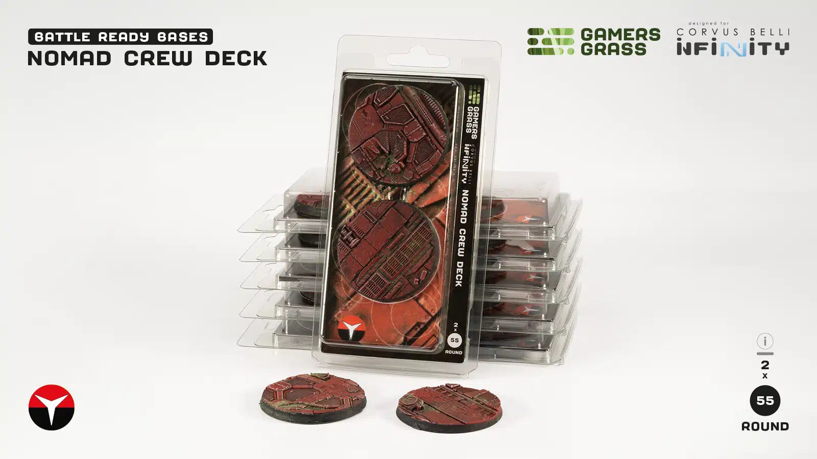 This pack contains 2 round Battle Ready Bases 55mm wide in a Nomad Crew Deck theme.