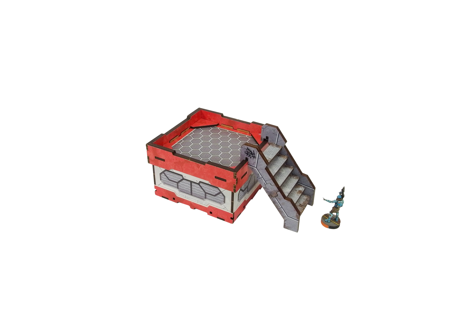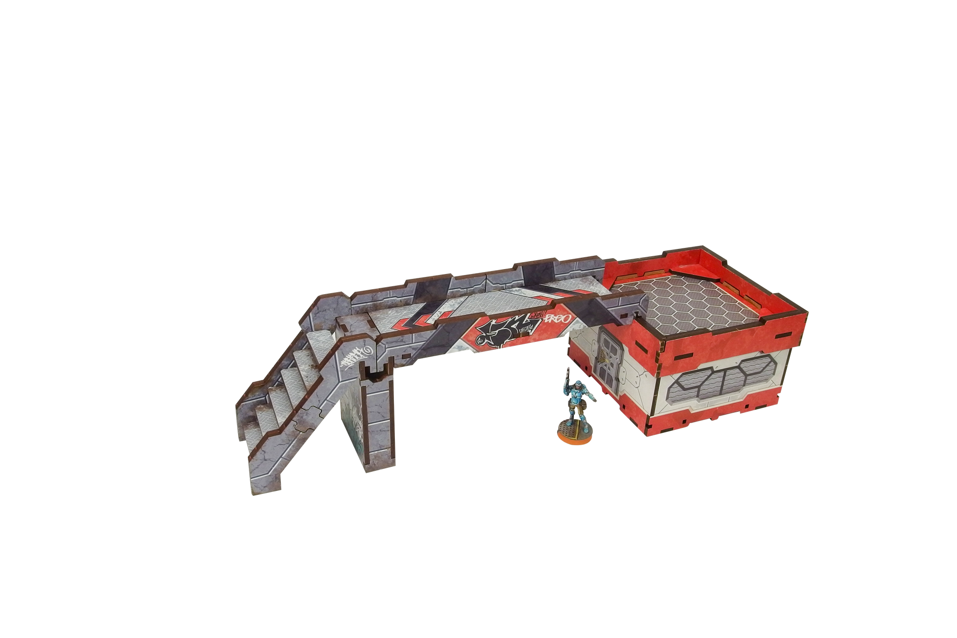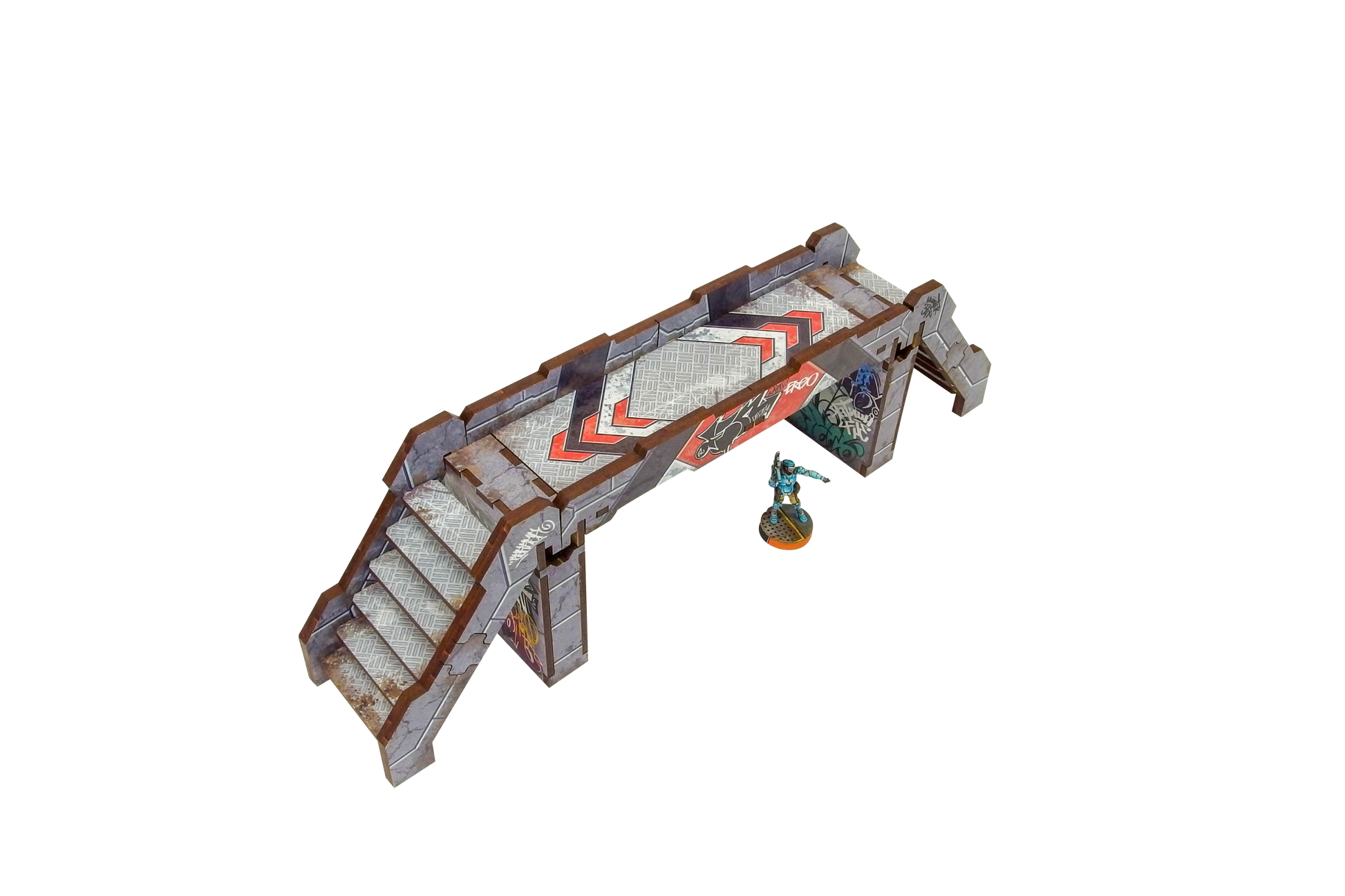 The Precinct Sigma Bridges & Stairs PREPAINTED set consists of 3 bridges (wide enough for 40mm bases), 3 stairs sections and 3 pillars.