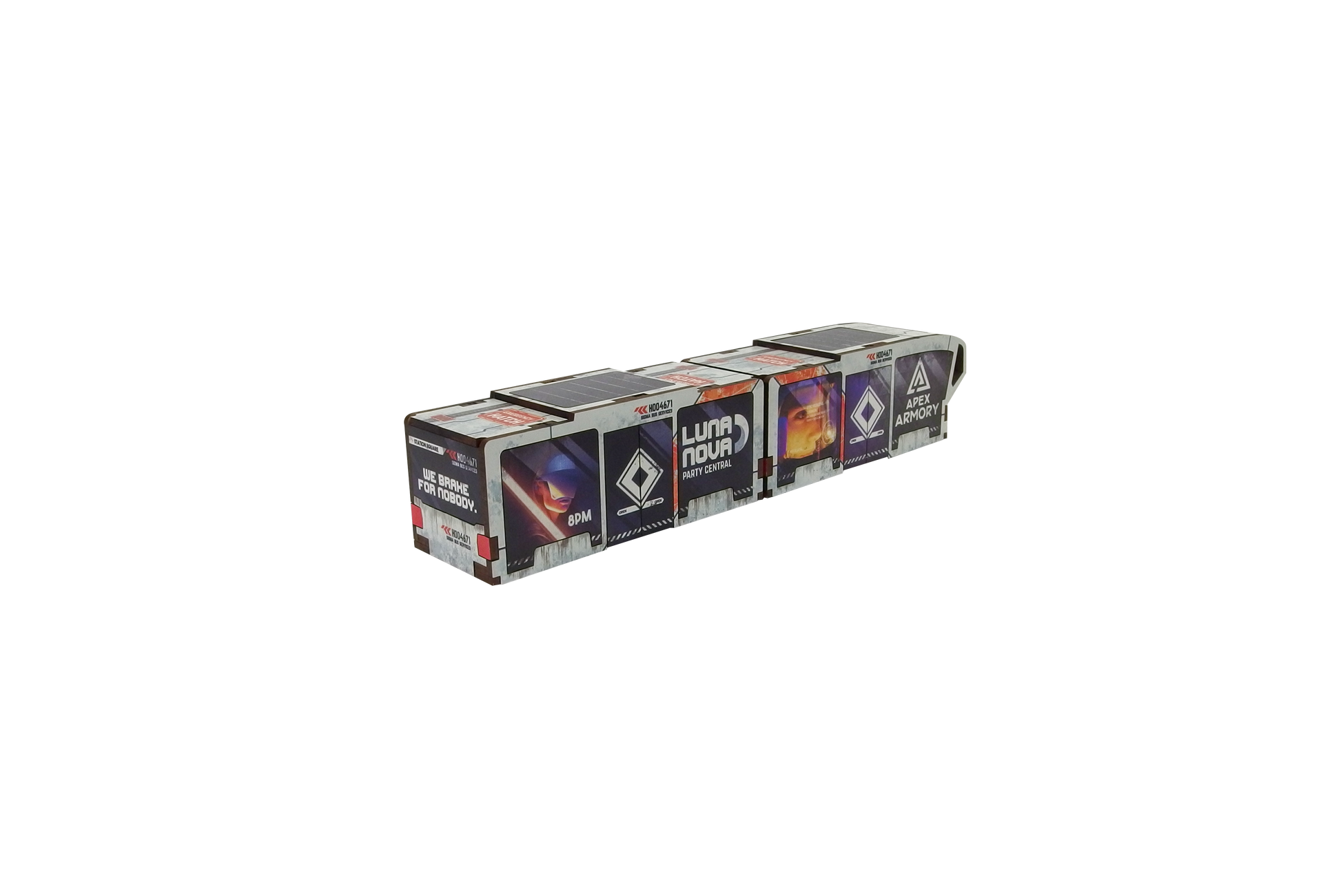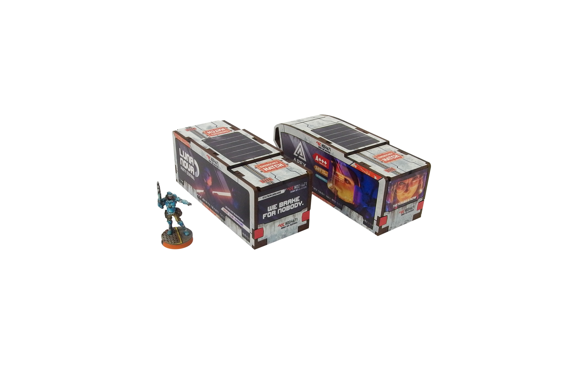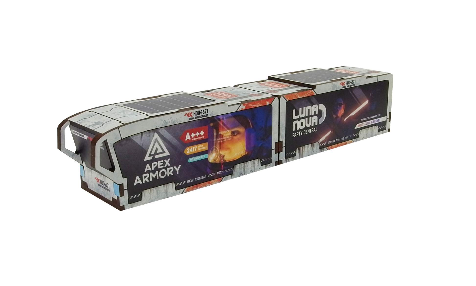The Precinct Sigma Bus Services PREPAINTED set consists of one bus and one trailer. It can be used as an articulated vehicle or a single bus and a pod.