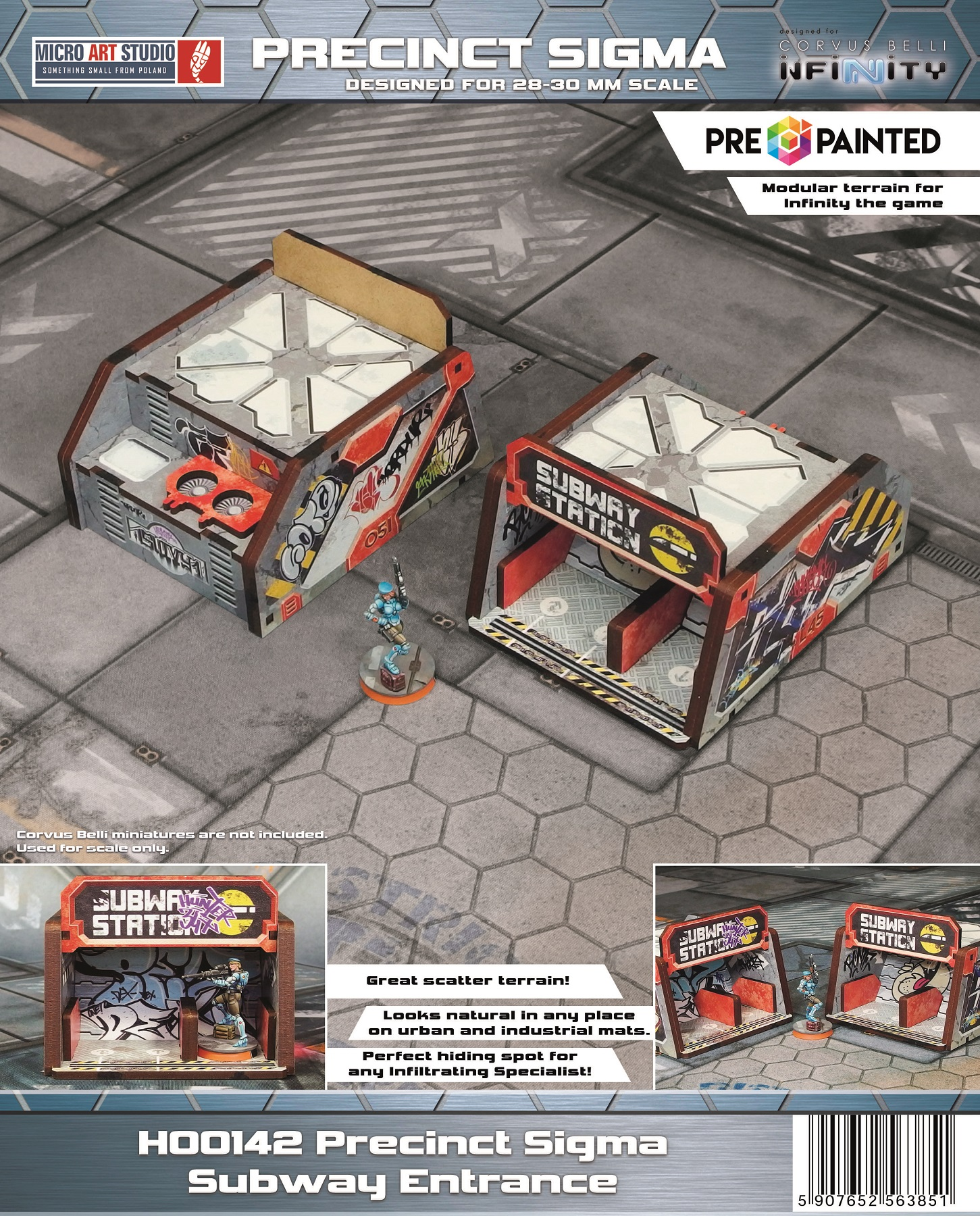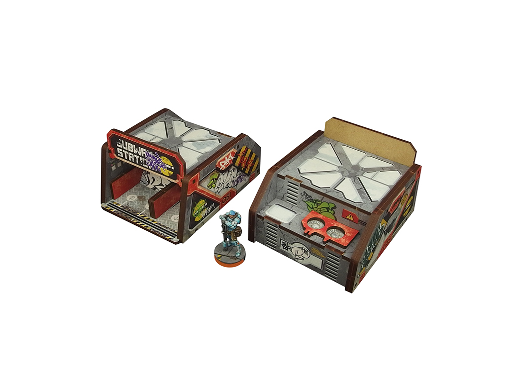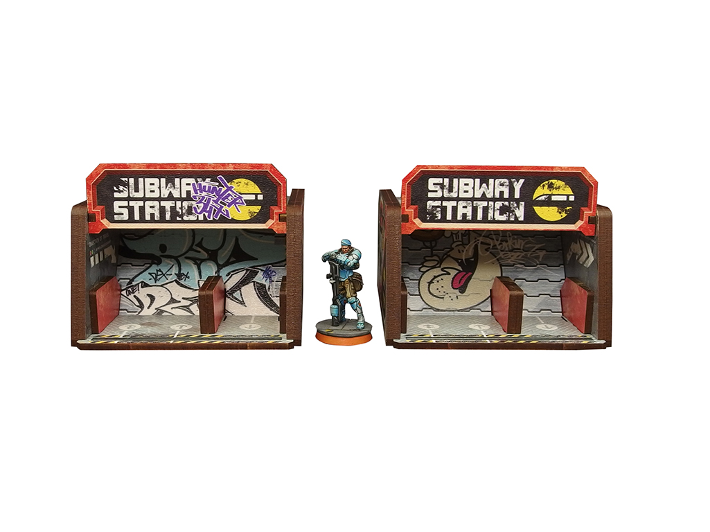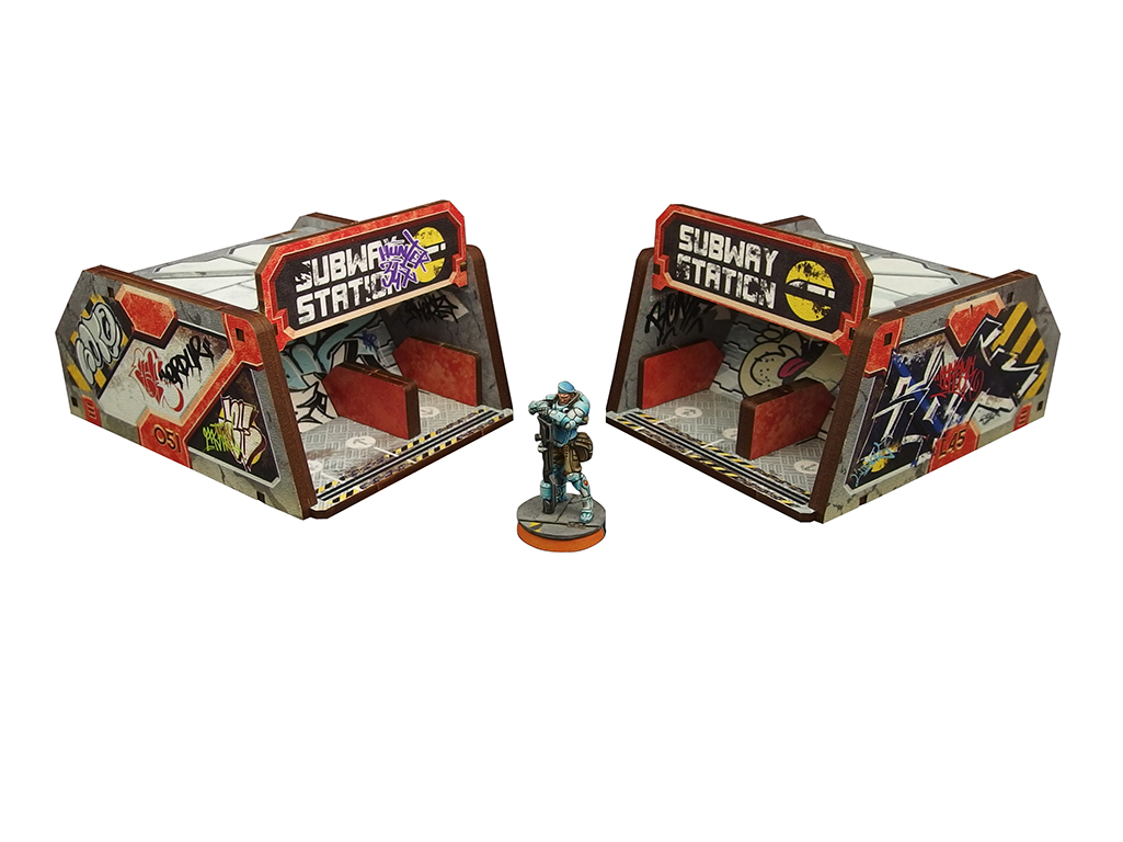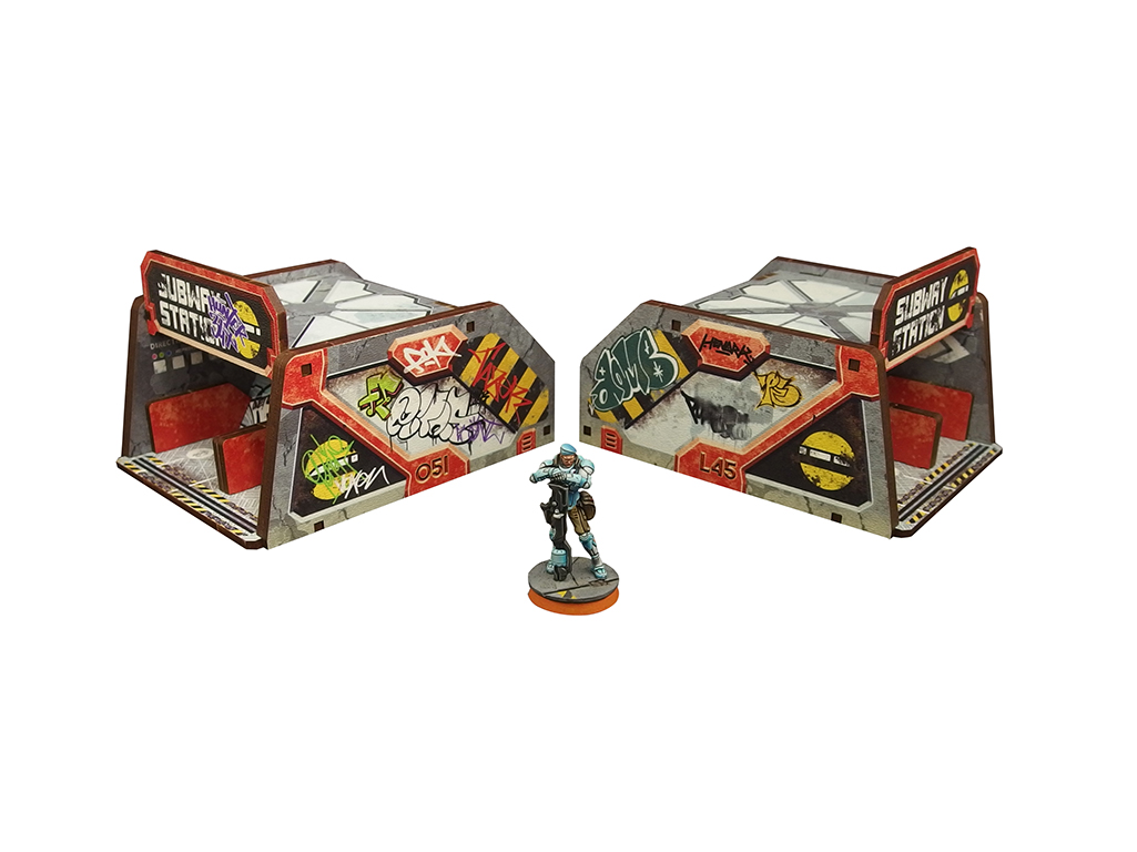 The Precinct Sigma Subway Entrance PREPAINTED set consists of 2 buildings, dedicated for Infinity the Game by Corvus Belli.